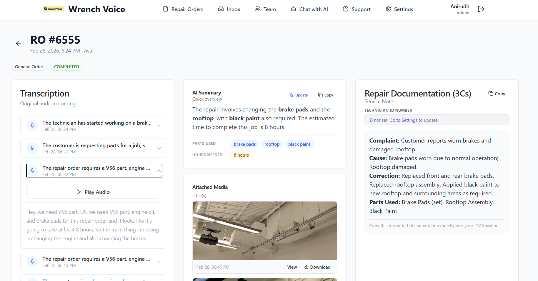 Our AI understands the nuance and perfectly shows a line-wise summary and 3Cs documentation, ready for DMS copy-paste after the RO is complete.